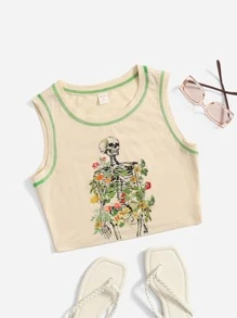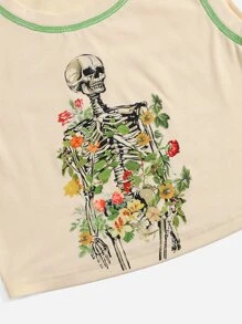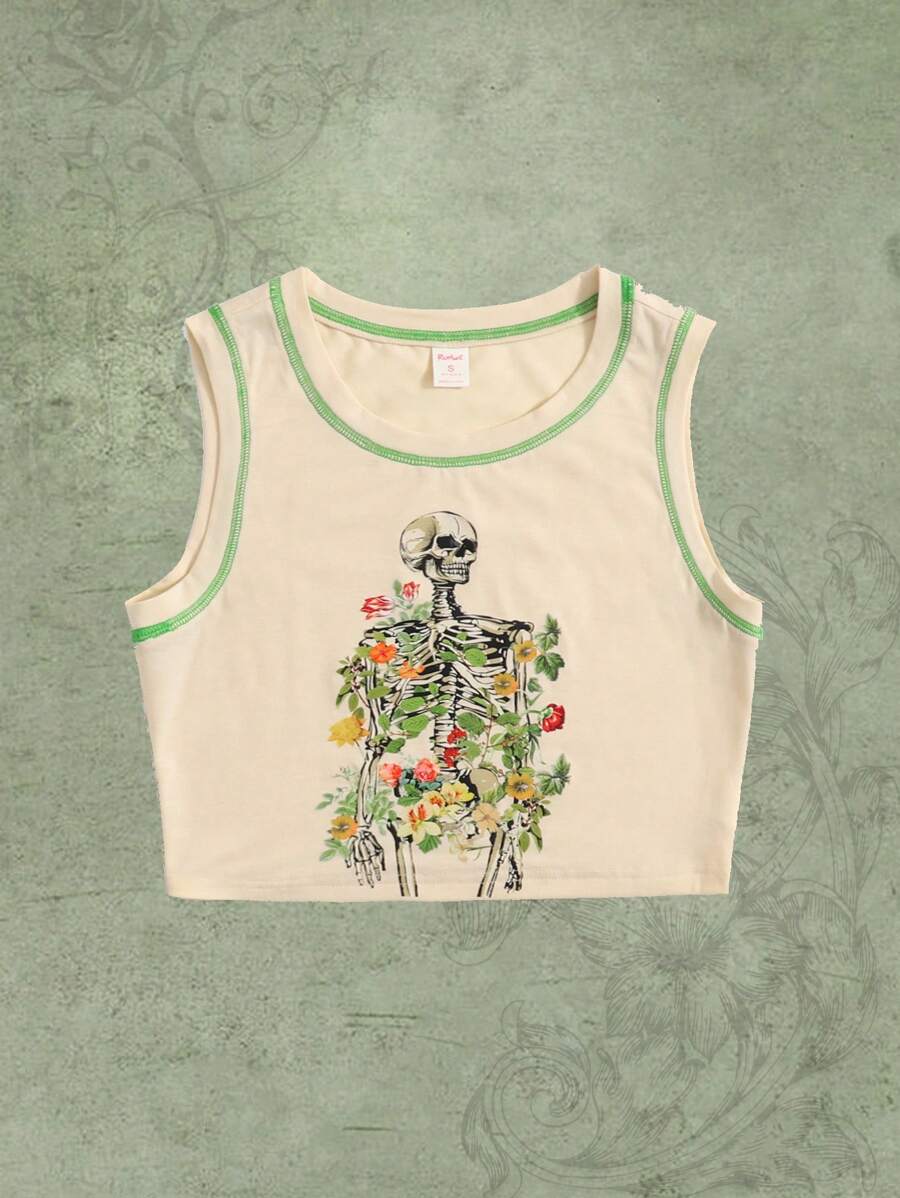 Fairycore Stitching Trim Skull & Floral Graphic Tank Top