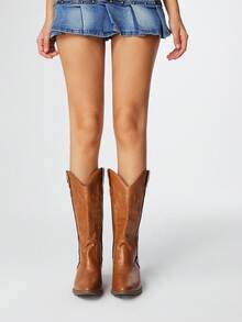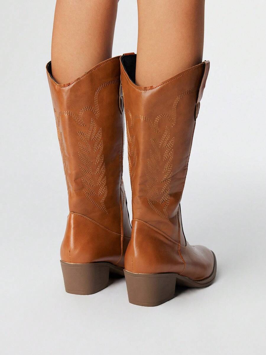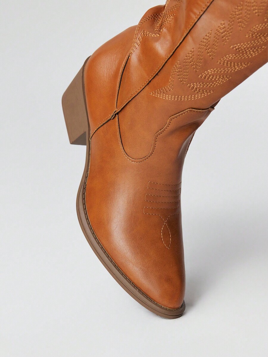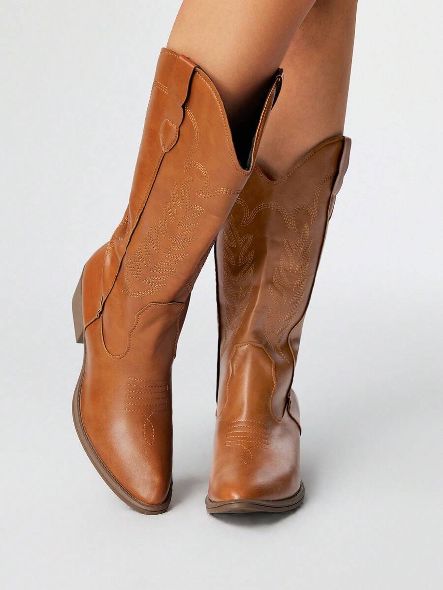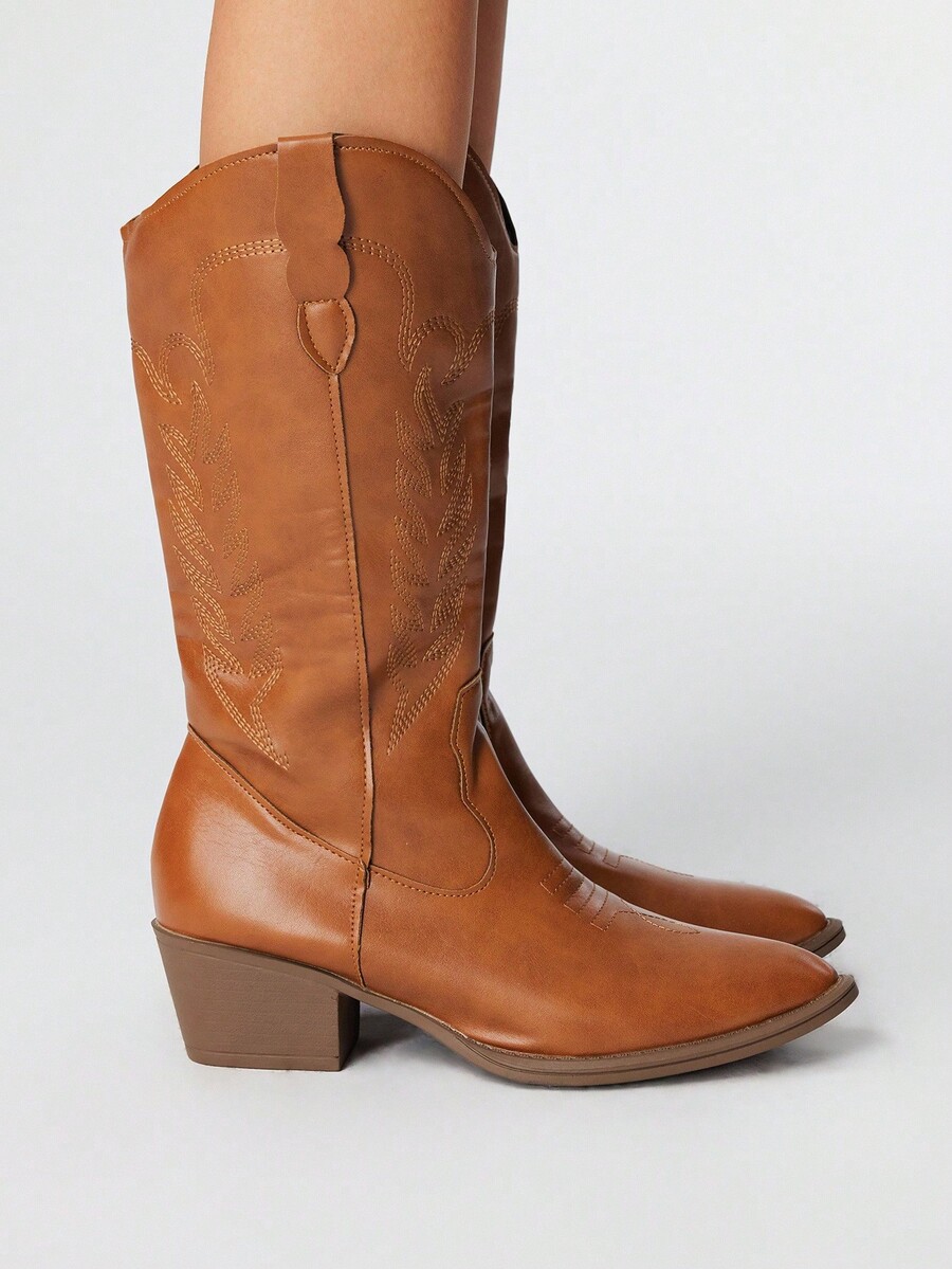 Fairycore Women's Brown Pointed Toe Low Heel Western Boots, Slip-On Riding Tall Boots, College Style Knee-High Boots, Embroidered V-Cut Slip-On Leather Boots, Mid-Calf Boots