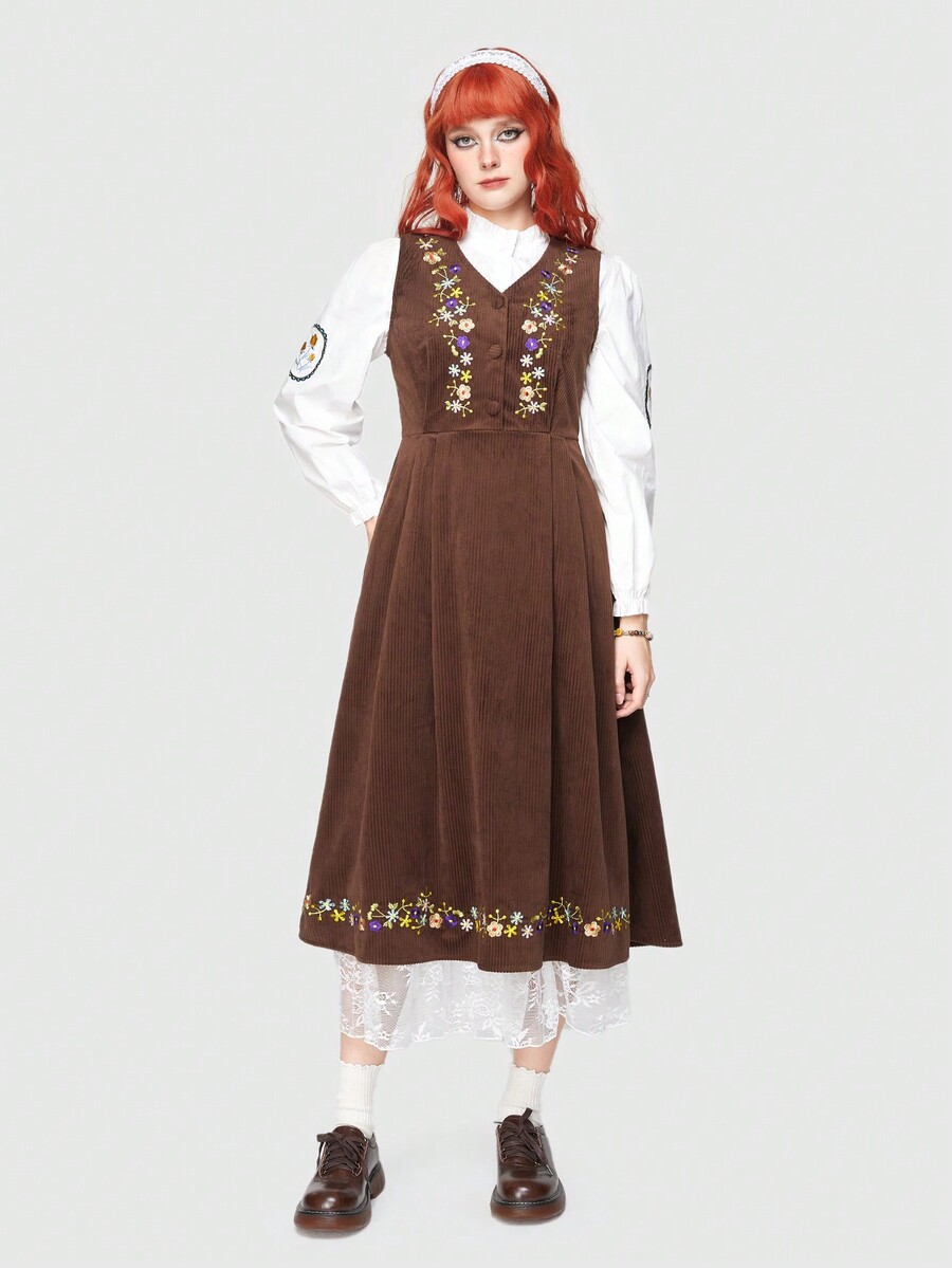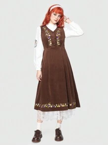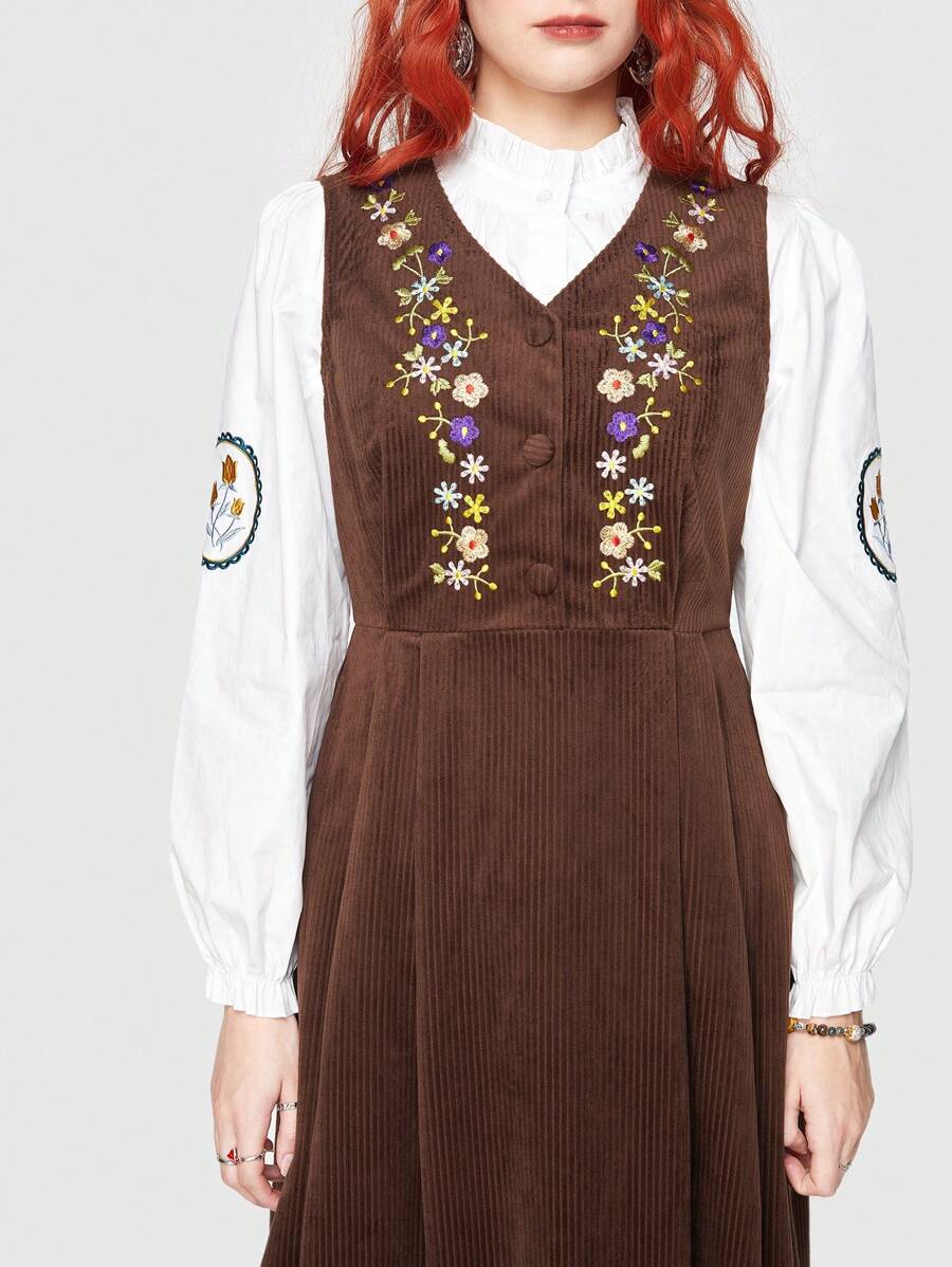 Fairycore Women's Corduroy Floral Embroidery Sleeveless Dress