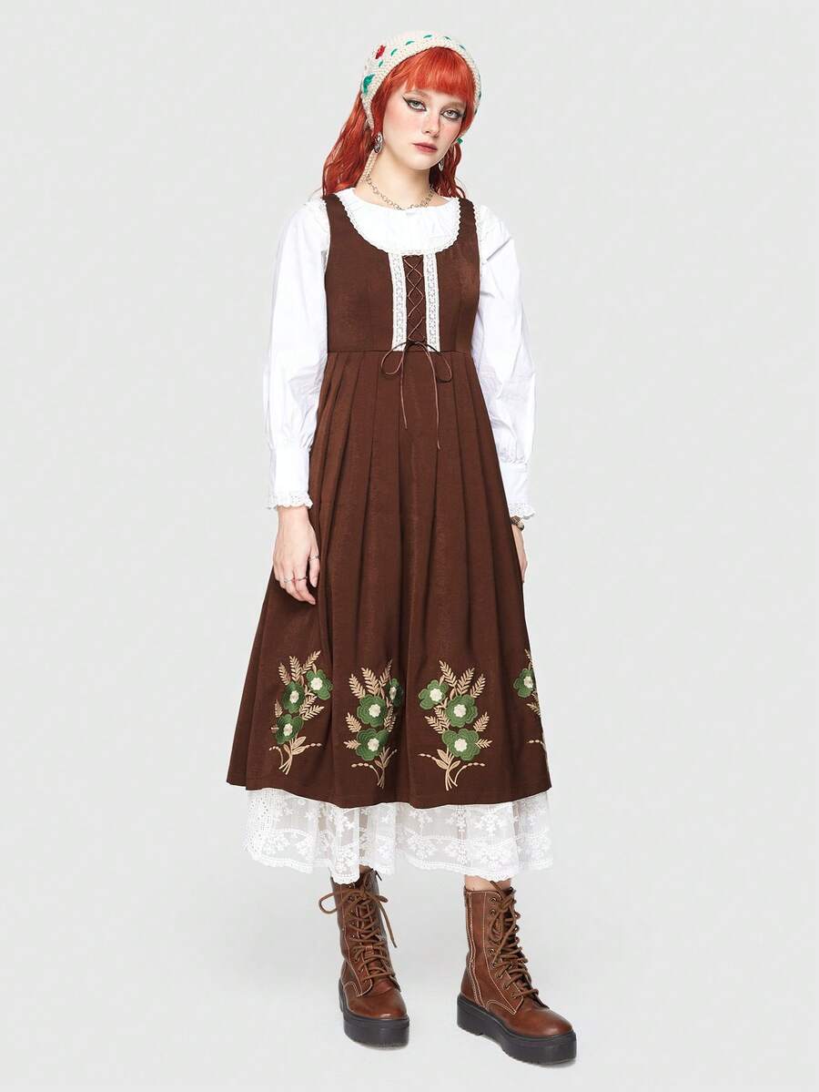 Fairycore Women's Floral Embroidery Belted Dress