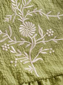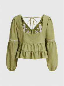 Fairycore Women's Floral Embroidery V-neck Lantern Sleeve Shirt With Ruffle Hem