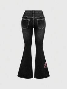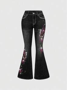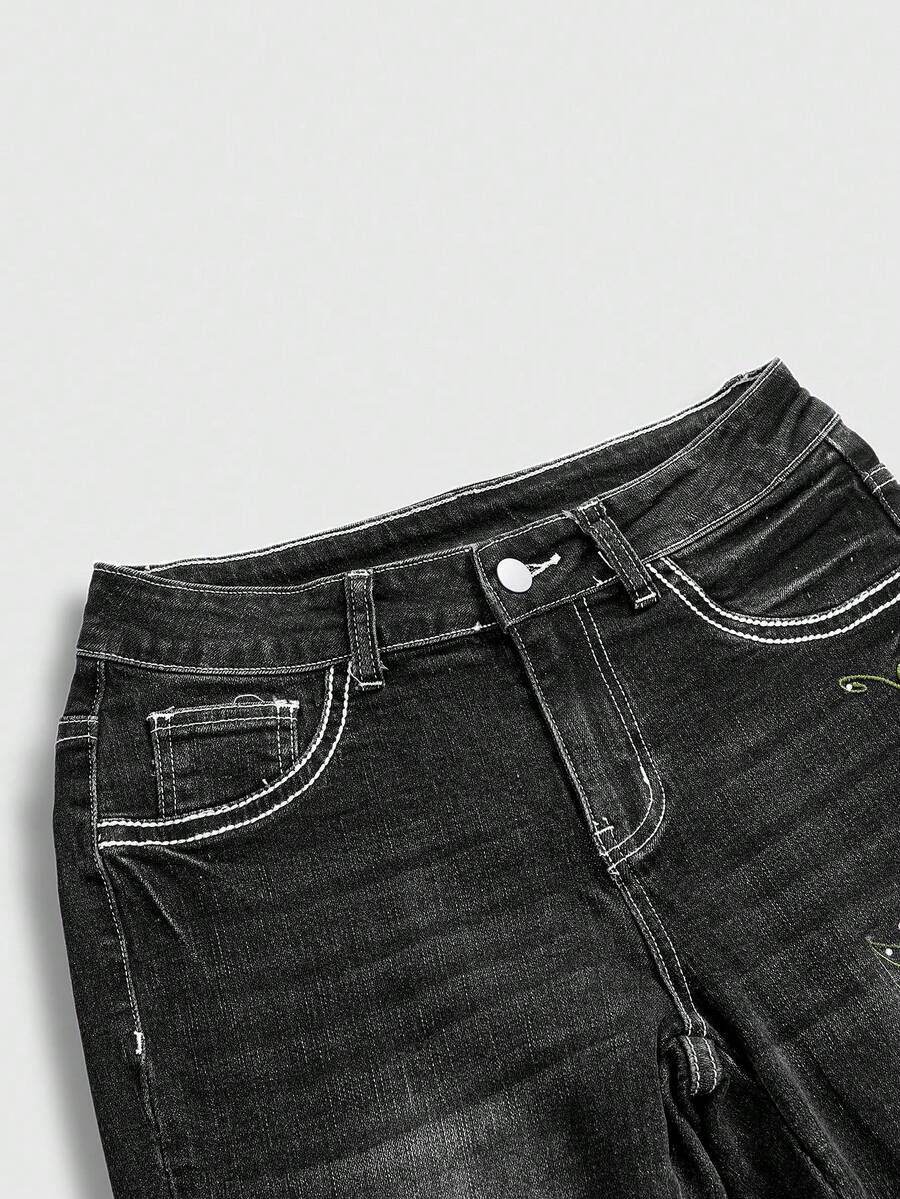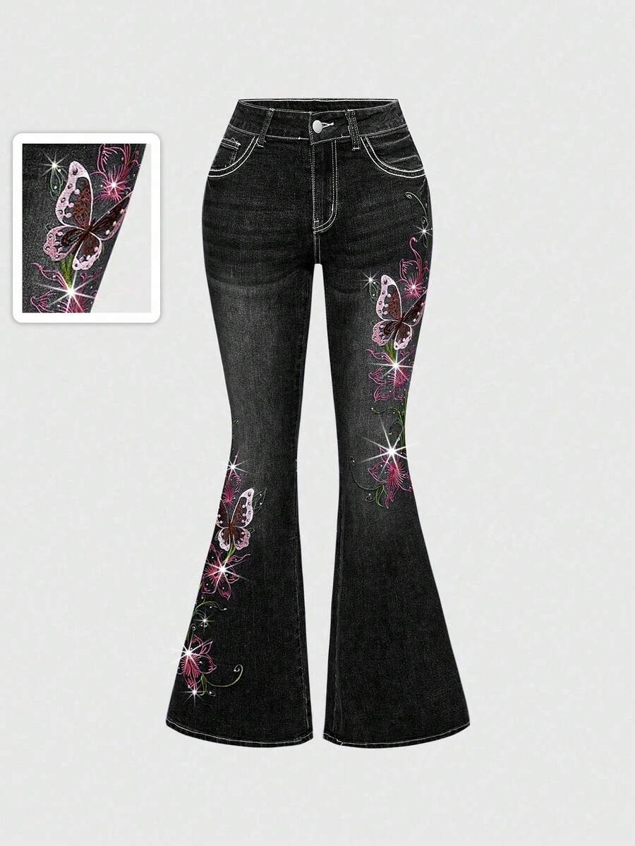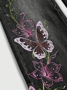 Fairycore Women's Retro Y2K Sexy Butterfly Vine Embroidered Rhinestone Flare Jeans
