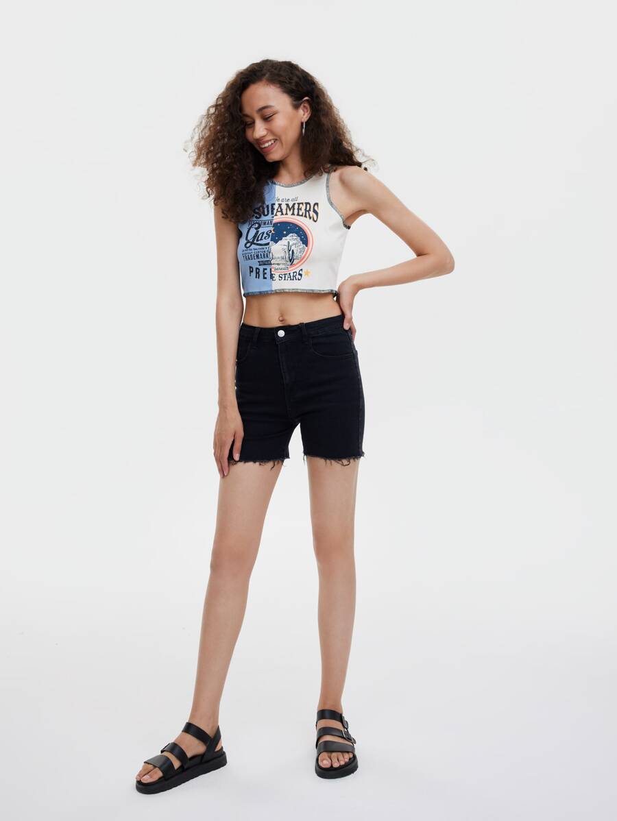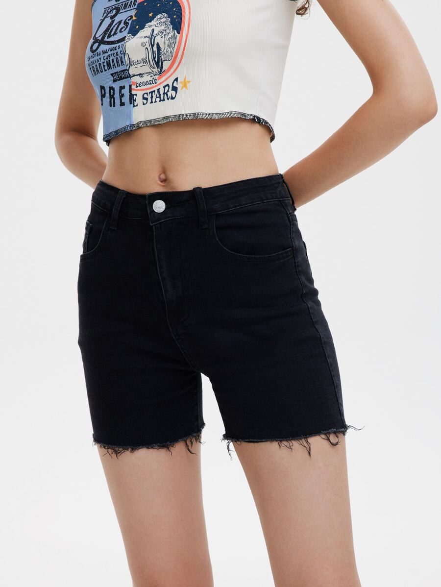 Fire Embroidery Raw Hem Denim Shorts