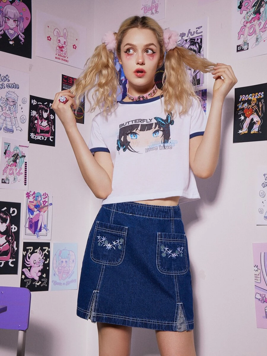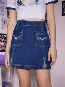 Floral Embroidery Denim Skirt