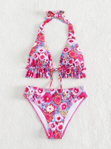 Floral Print Bikini Set Tie Front Ruffle Hem Halter Bra & Bikini Bottom 2 Piece Bathing Suit