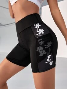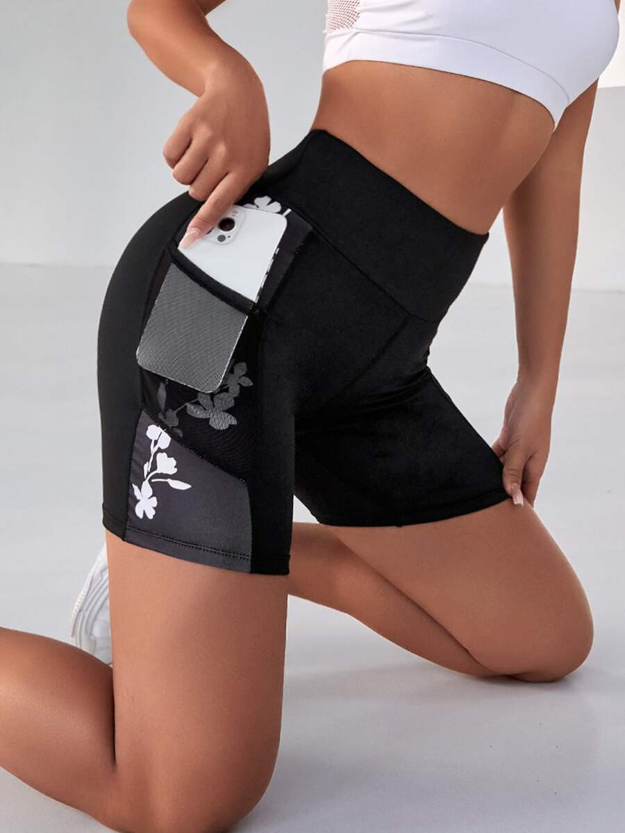 Floral Print Wide Waistband Sports Shorts With Phone Pocket