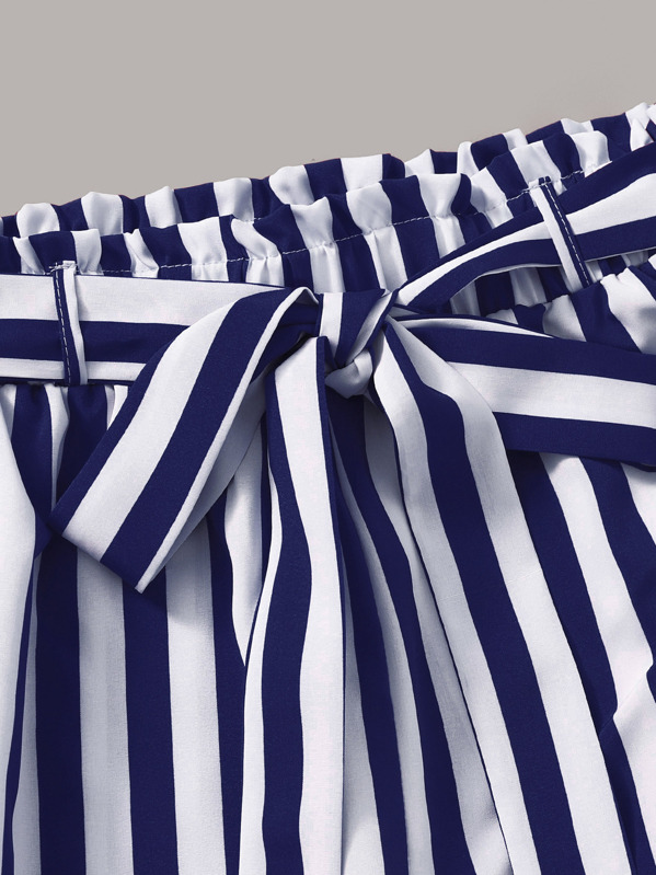 Frilled Button Bardot Top & Striped Paperbag Waist Trousers Set
