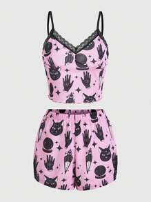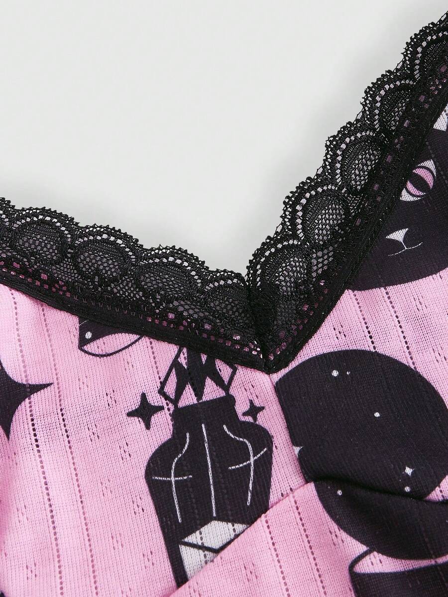 GUZLBT Cartoon Graphic Contrast Lace Cami Top & Shorts PJ Set