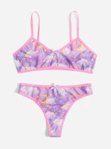 Galaxy Print Contrast Binding Bow Decor Lingerie Set