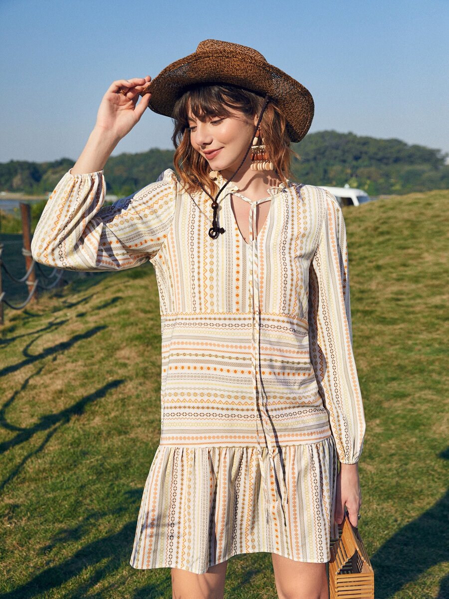 Geo Graphic Tie Neck Ruffle Hem Dress