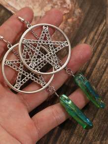 Goth 1pair Stone Decor Large Star & Circle Shaped Earrings With Long Chain For Women