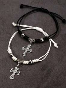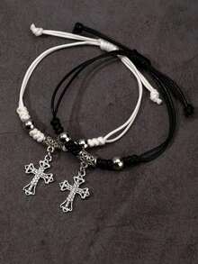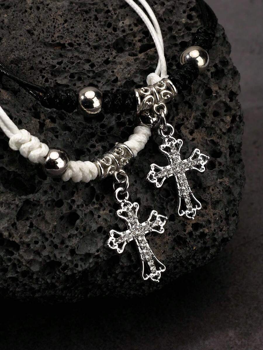 2pcs Vintage Gothic Style Cross Bracelet With Rhinestone For Couples, Men, Women