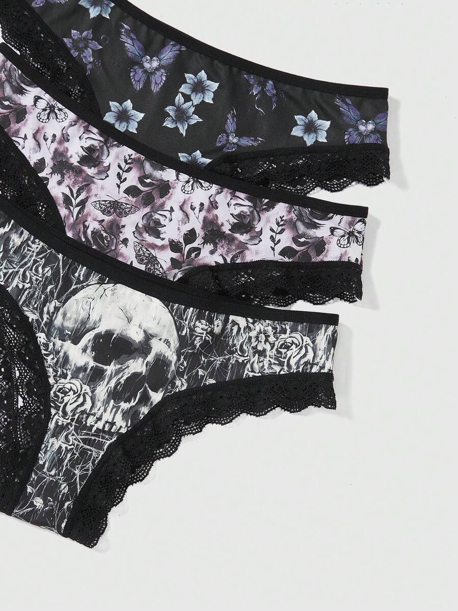 Goth 3Packs Skull & Floral Print Contrast Lace Brief