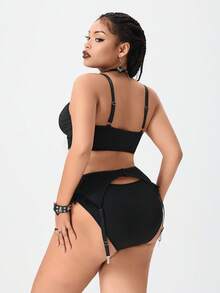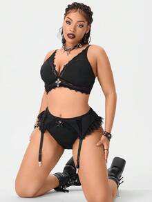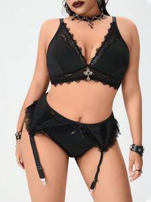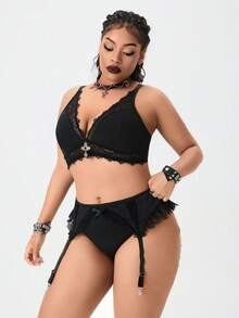 Goth 3pcs Plus Size Gothic Lace Garter Belt & Thong Lingerie Set, Wireless