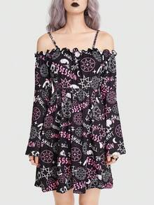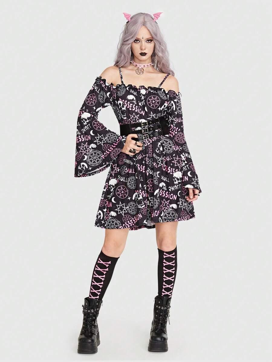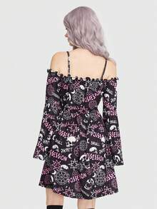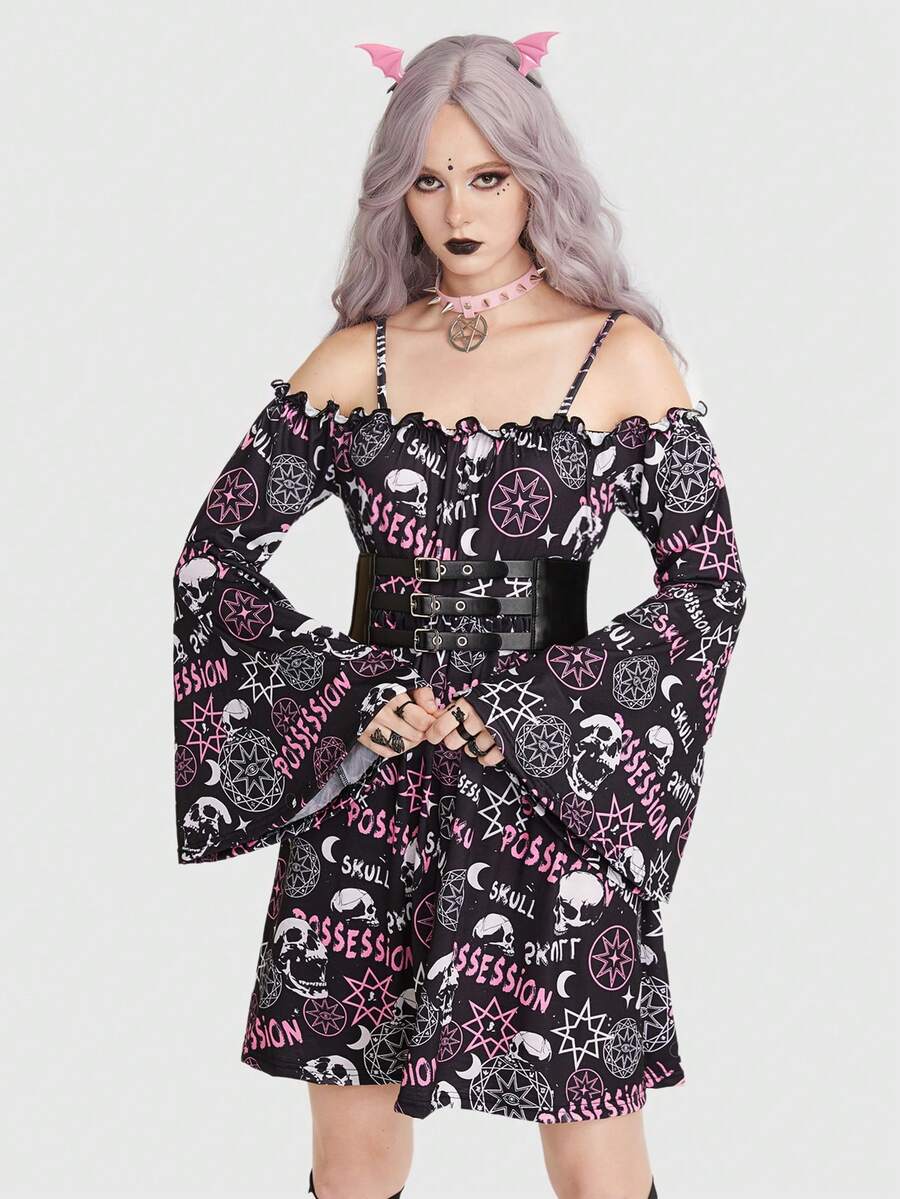Goth Allover Print Cold Shoulder Flared Sleeve Dress Without Corset