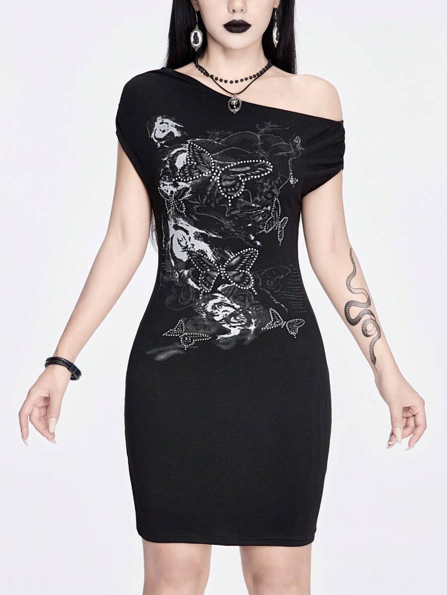 Goth Butterfly & Flower Print Rhinestone Embellished Bodycon Asymmetrical Neck Sexy Women's Dress