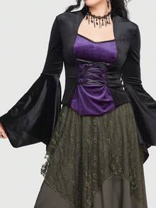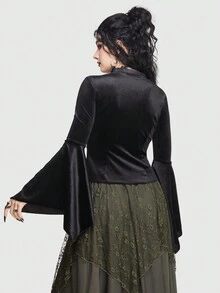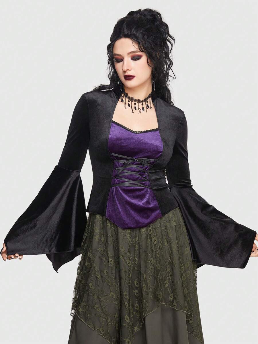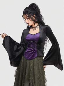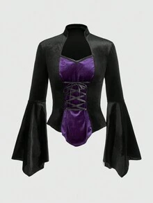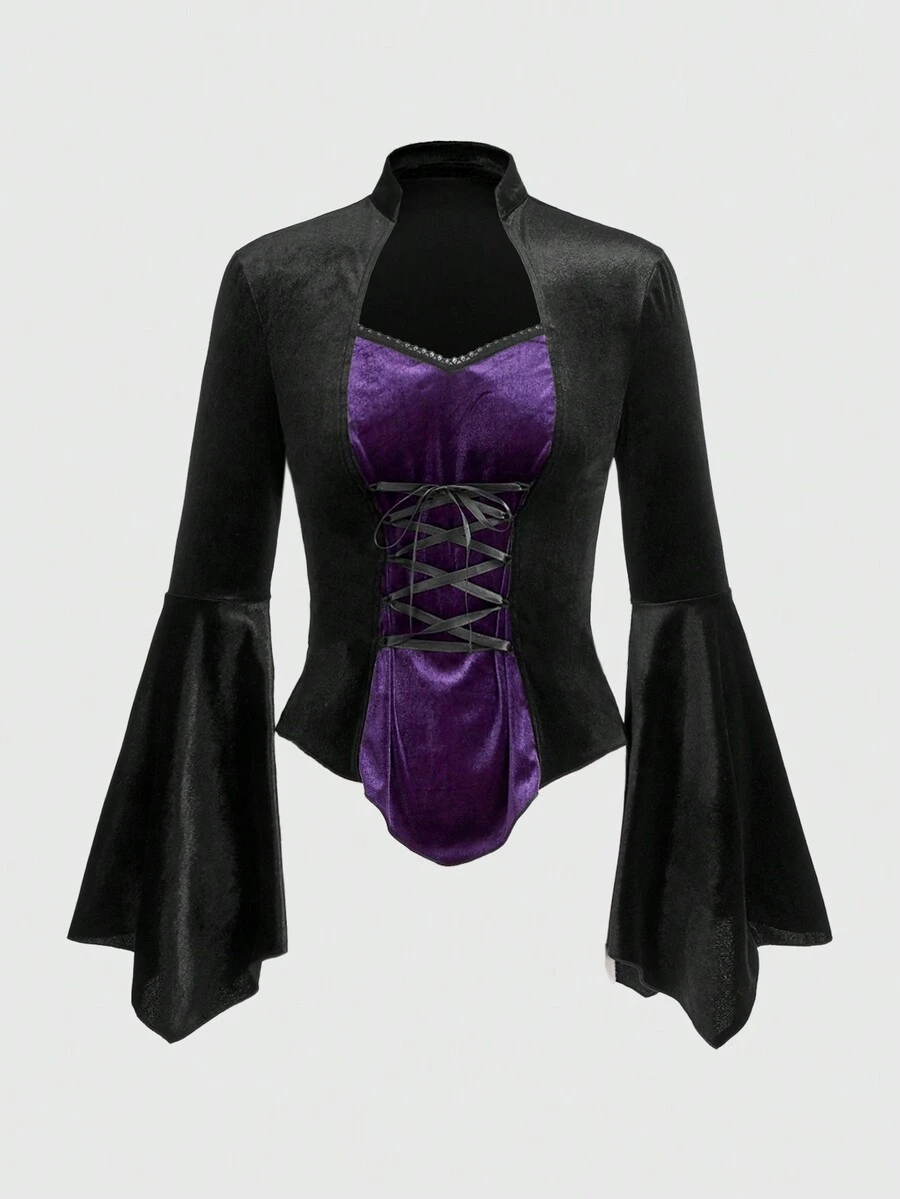 Goth Colorblock Lace Up Front Trumpet Sleeve Top