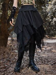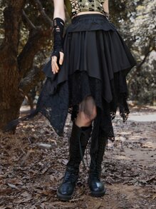 Goth Contrast Lace Asymmetrical Hem Skirt