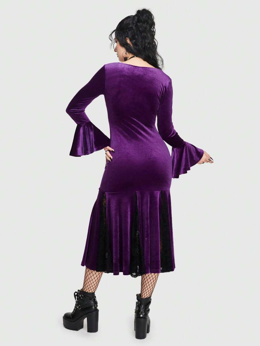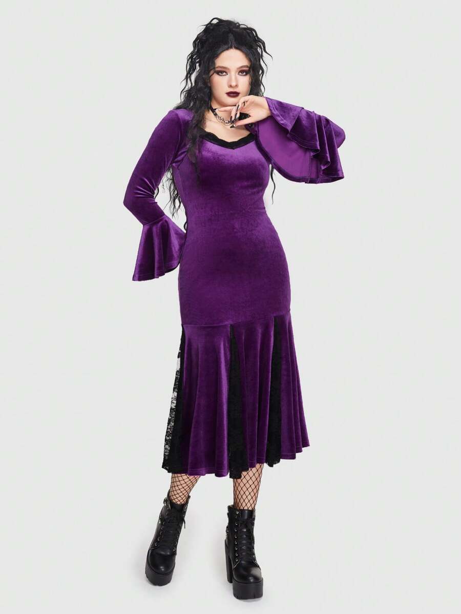 Goth Contrast Lace Flounce Sleeve Ruffle Hem Velvet Dress