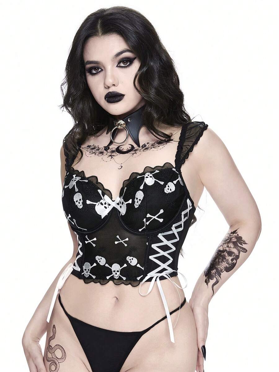 Goth Dark Skull Criss Cross Tie Ruffle Underwire Bralette