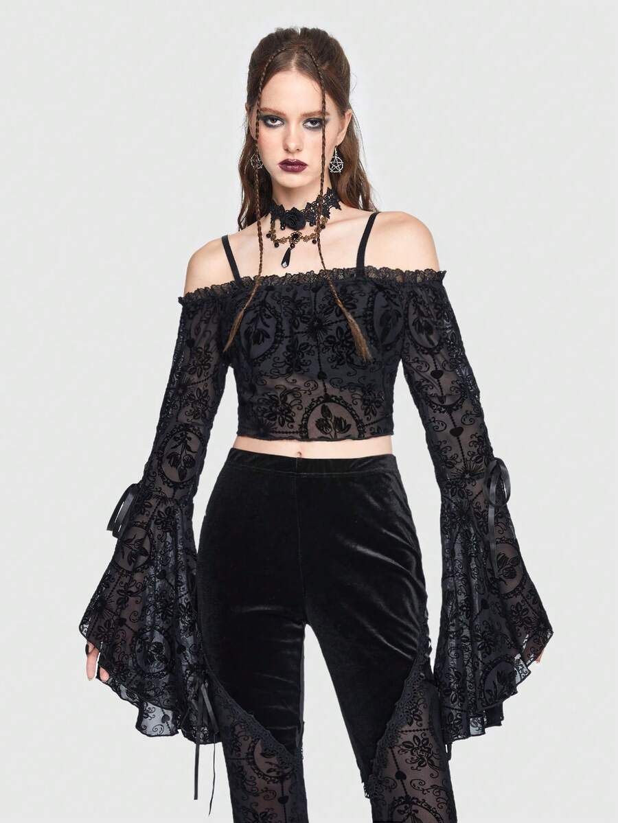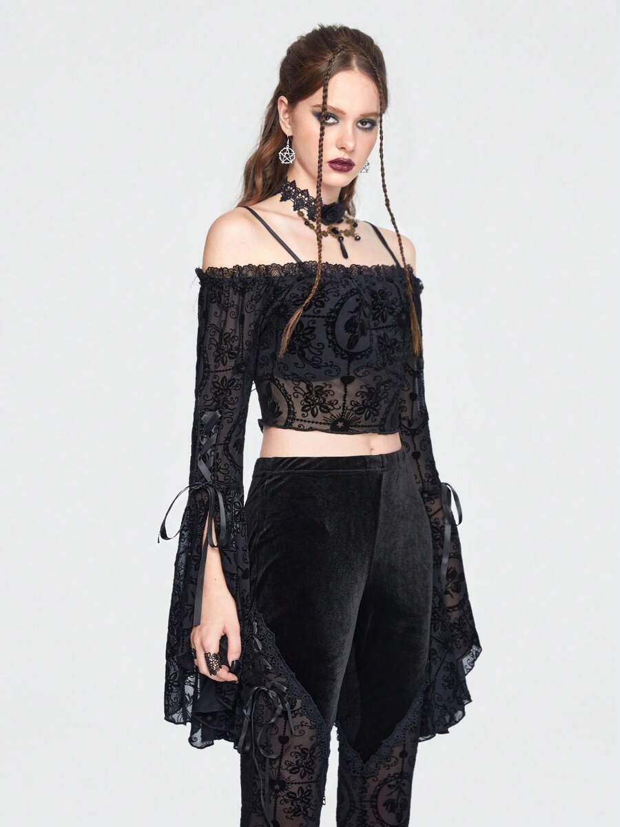 Goth Floral Print Contrast Lace Cold Shoulder Crop Top