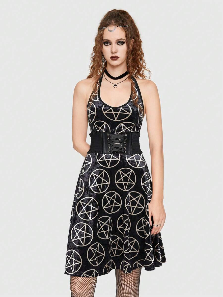 Goth Geo Graphic Halter Neck Dress Without Belt