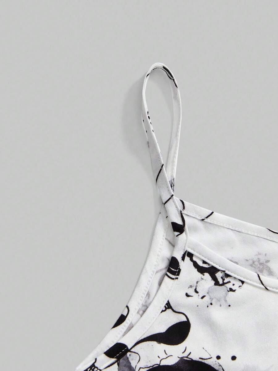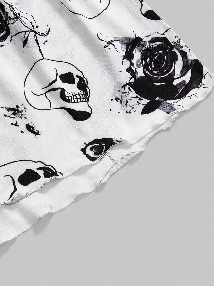 Gothic Skull & Rose Print Satin Camisole & Shorts Pajama Set, Halloween
