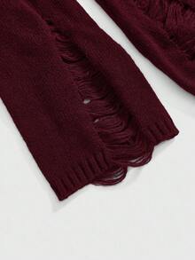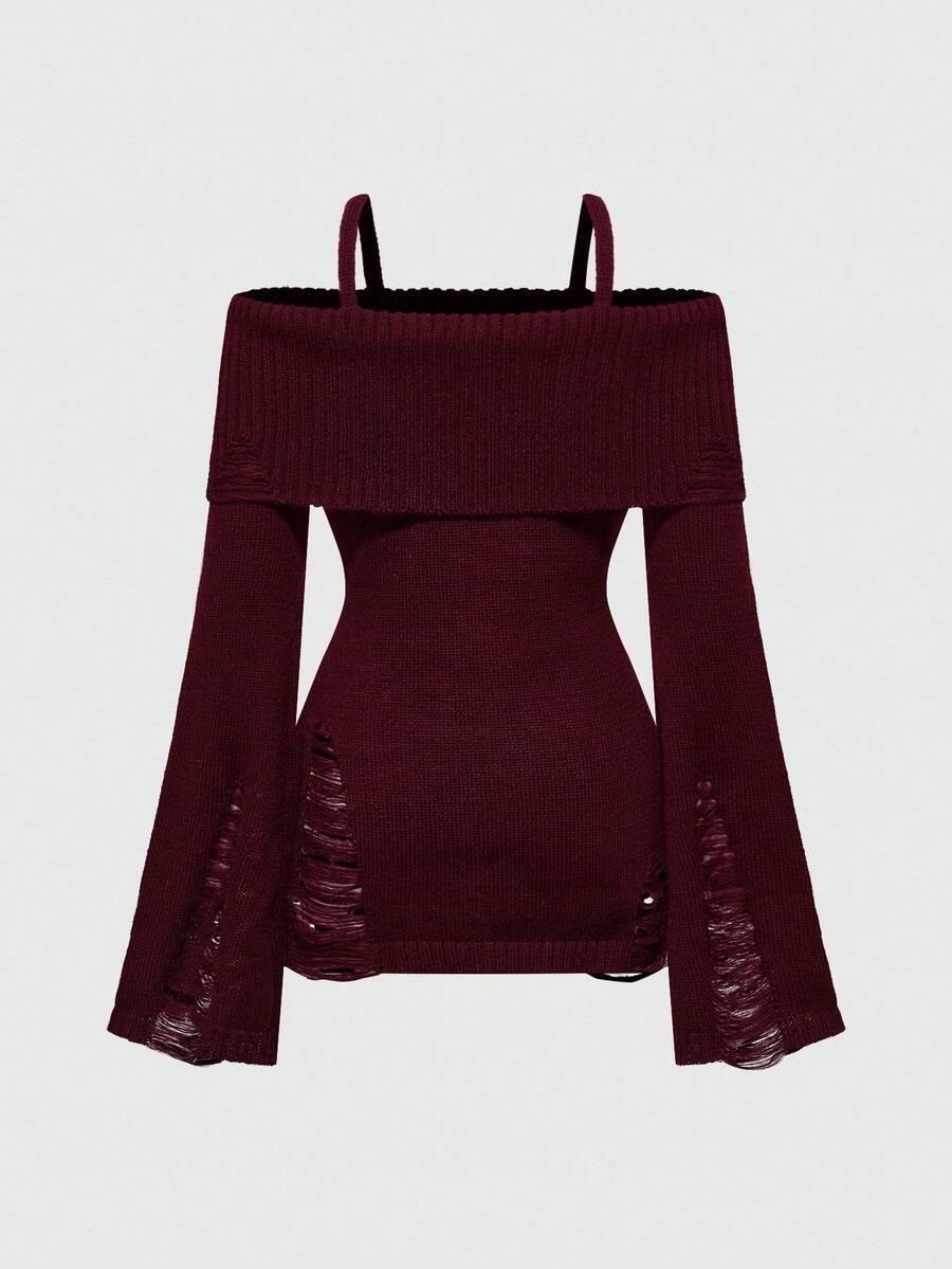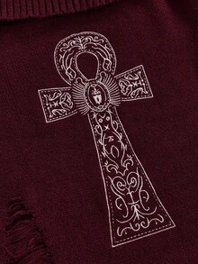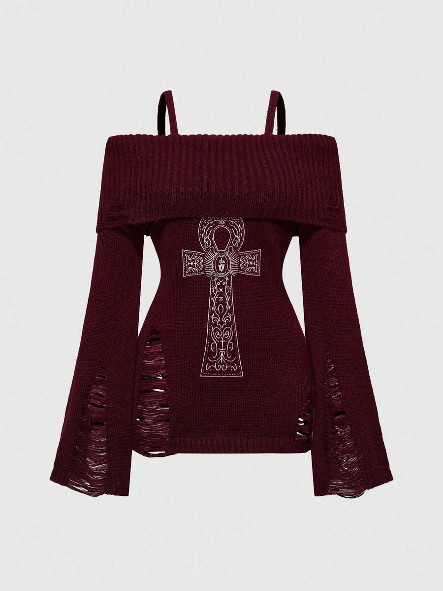 Goth Halloween Punk Ripped Design Ankh Cross Embroidery Cinched Off-Shoulder Camisole Sweater