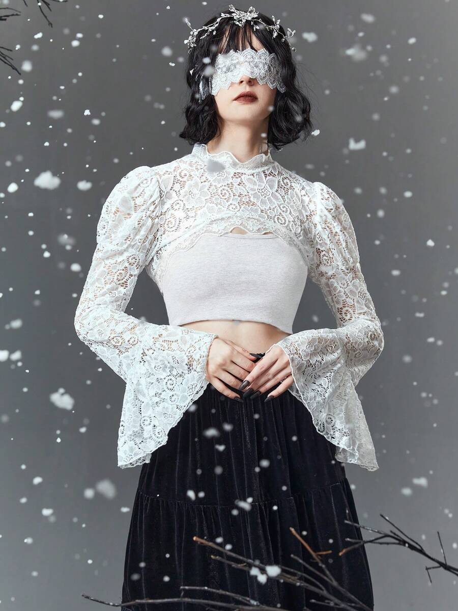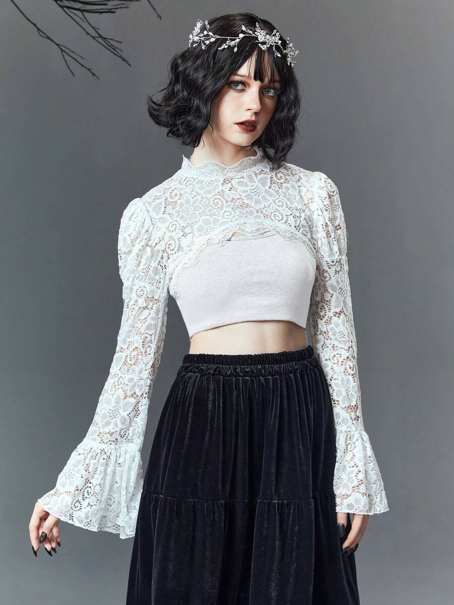 Goth Lace Flounce Sleeve Super Crop Top Without Cami Top