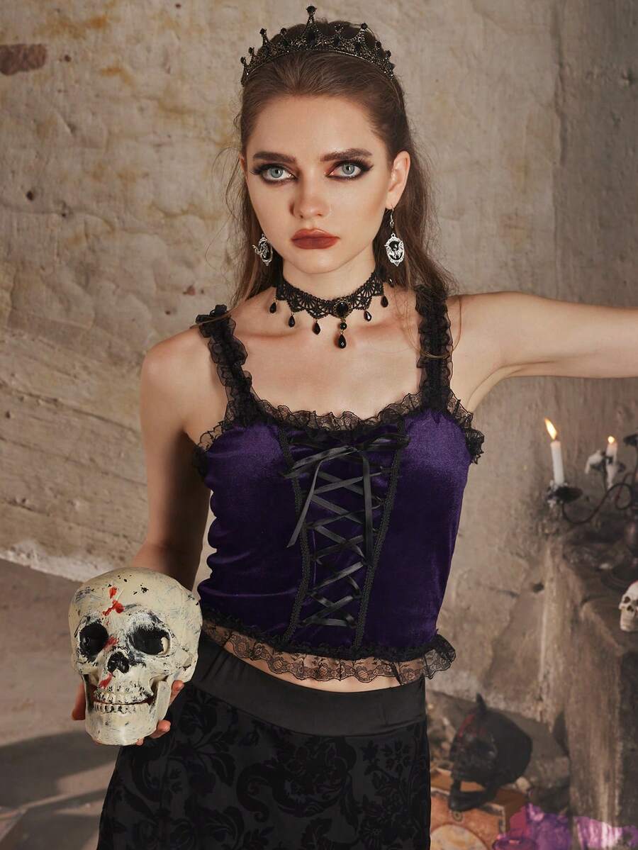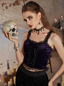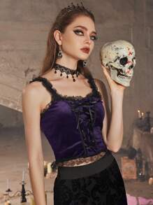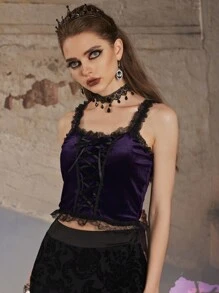 Goth Lace Up Contrast Lace Velvet Cami Top