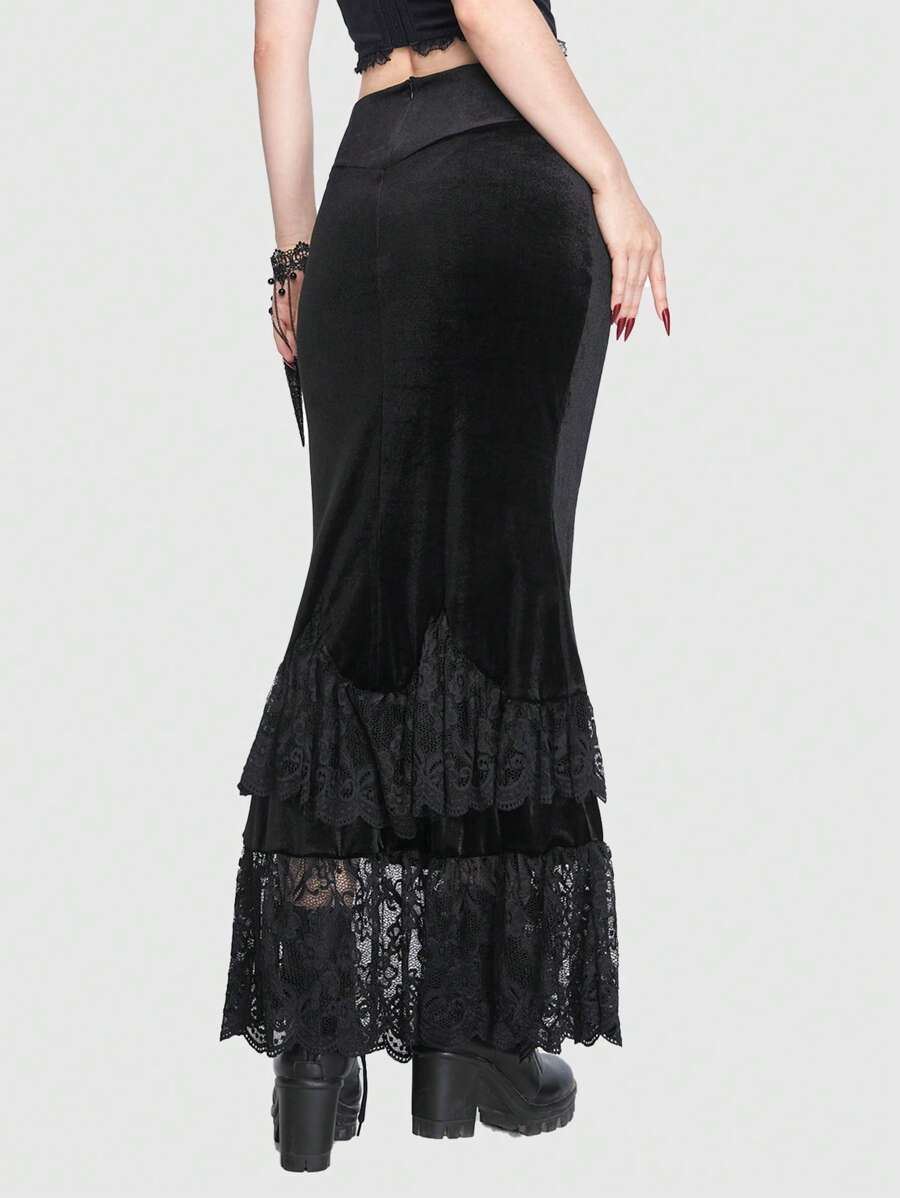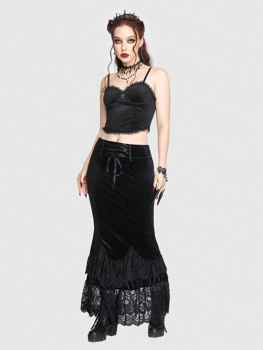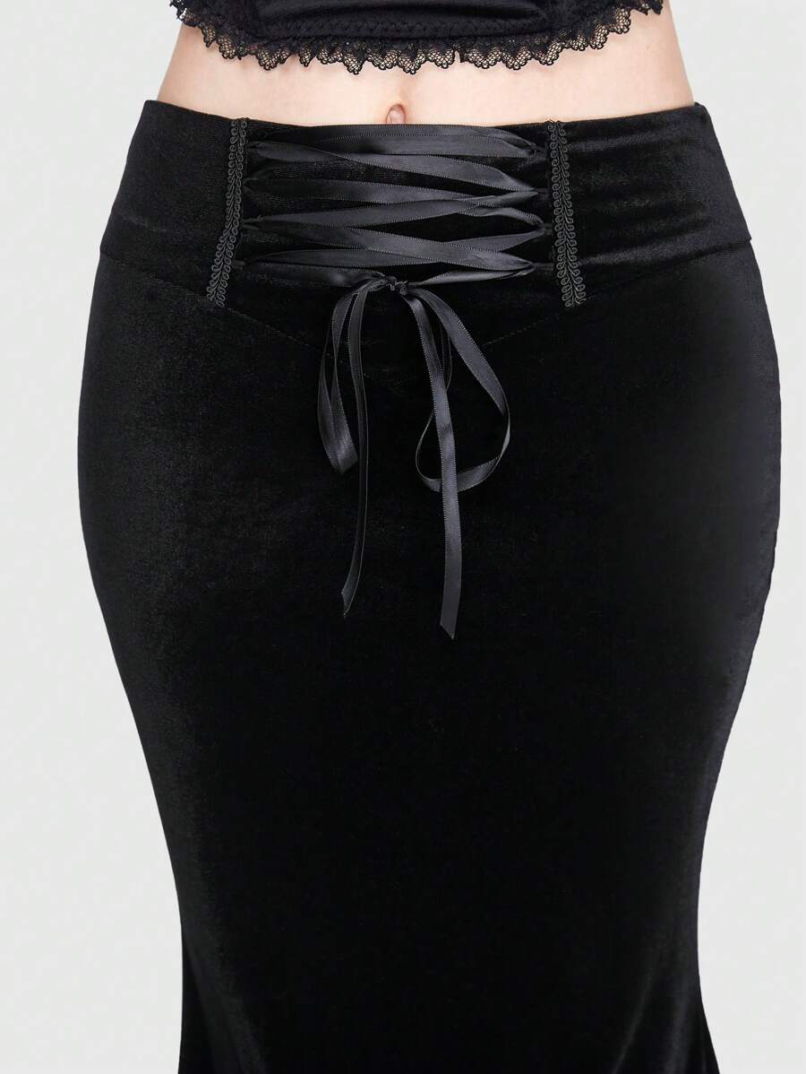 Goth Lace Up Front Contrast Lace Mermaid Hem Velvet Skirt