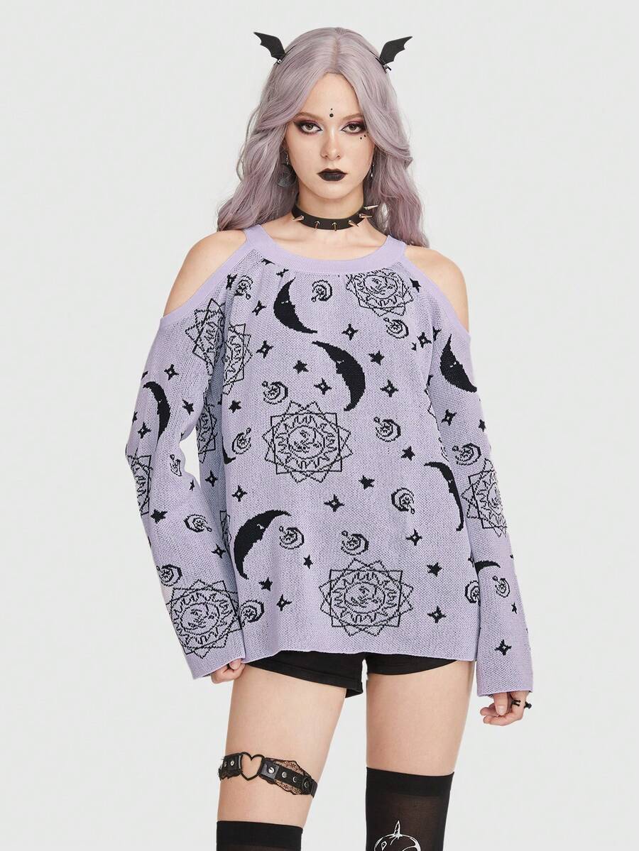 Goth Moon & Star Pattern Cold Shoulder Sweater