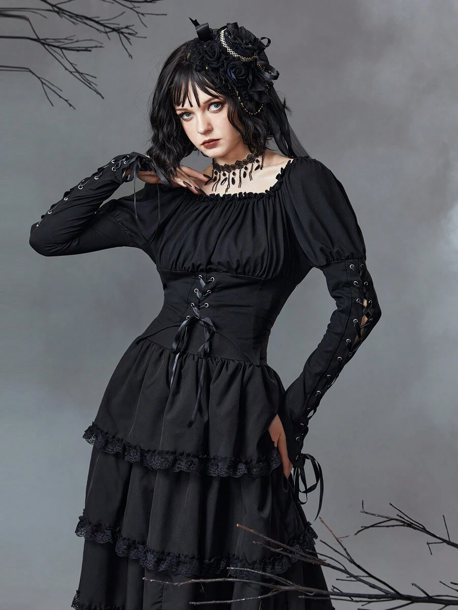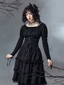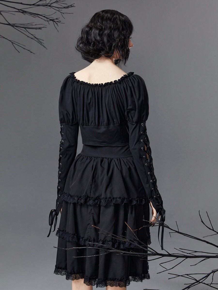 Goth Women's Dark Colored Square Neck Puff Sleeve Frill Hem T-Shirt With Tie Detail