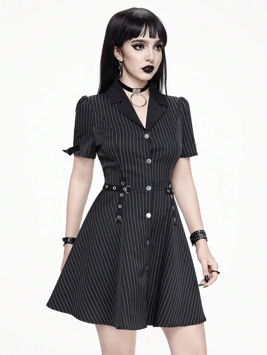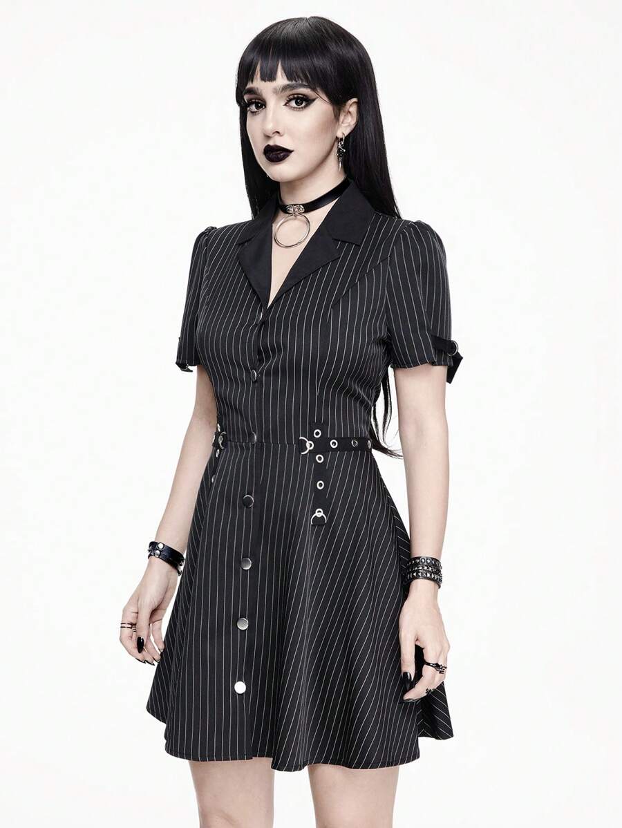 Narrow-Striped Professional Gothic Punk Style Metal Eyelet Belted Ladies' A-Line Dress With Suit Collar, School