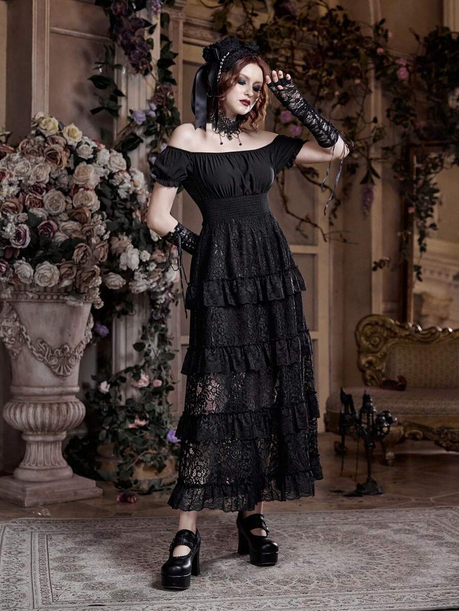 Goth Off Shoulder Ruffle Hem Shirred Contrast Lace Dress