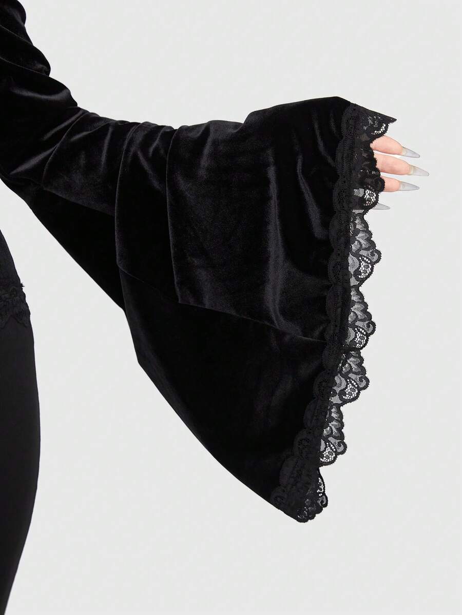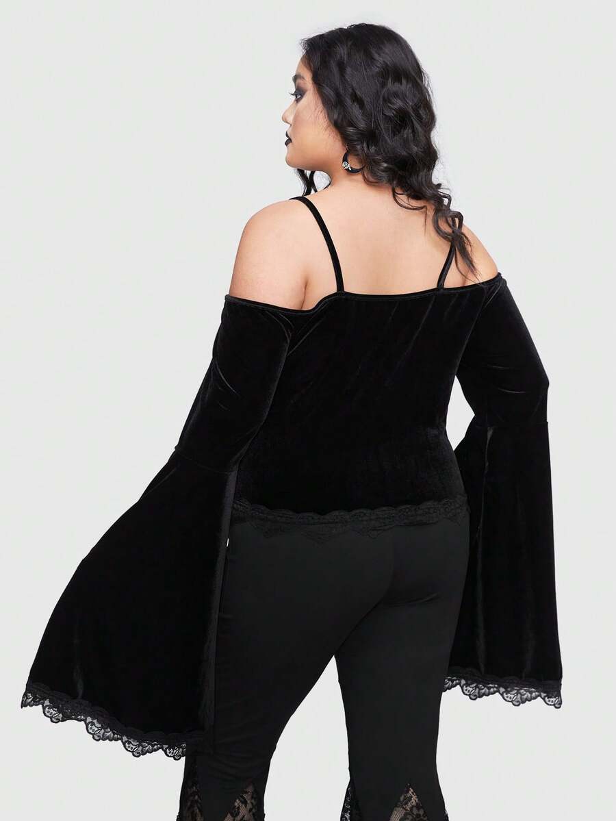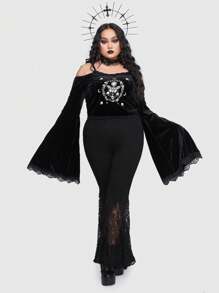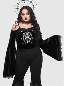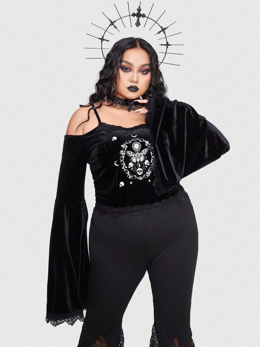 Goth Plus 1pc Skull & Butterfly Print Cold Shoulder Lace Trim Trumpet Sleeve Velvet Tee