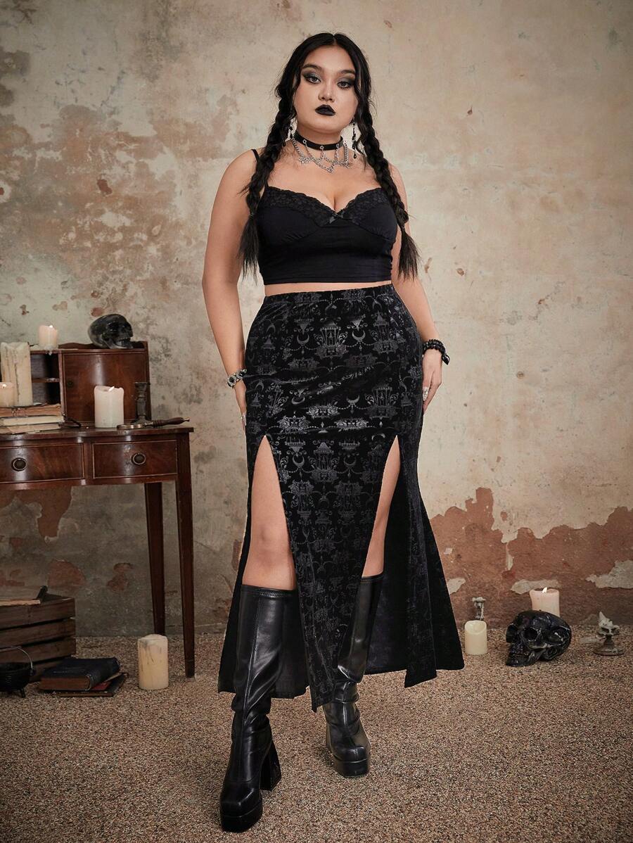 Goth Plus Jacquard Split Thigh Velvet Skirt