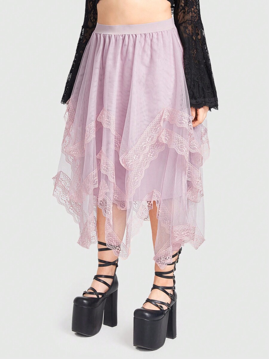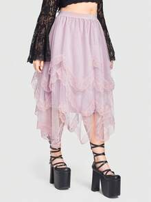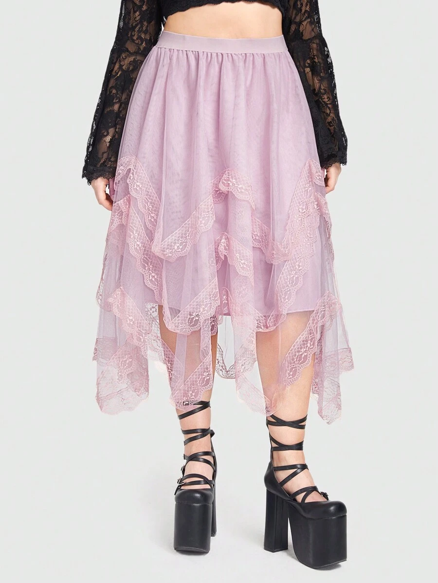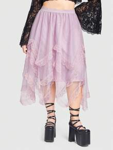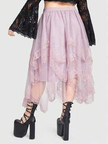 Goth Plus Lace Trim Asymmetrical Hem Mesh Skirt