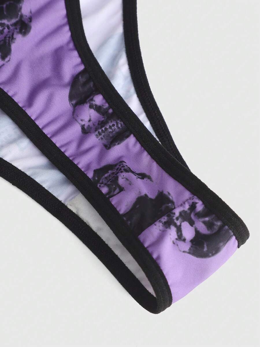 Plus Size Dark Gothic Skull Print Lace Patchwork Lingerie Bralette And Panty Set