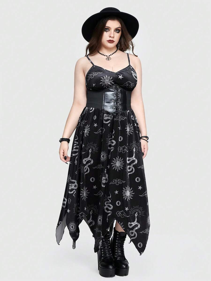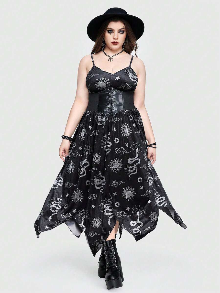 Plus Size Gothic Velvet Snake, Star And Moon Printed Asymmetrical Hem Slimming Long Dress