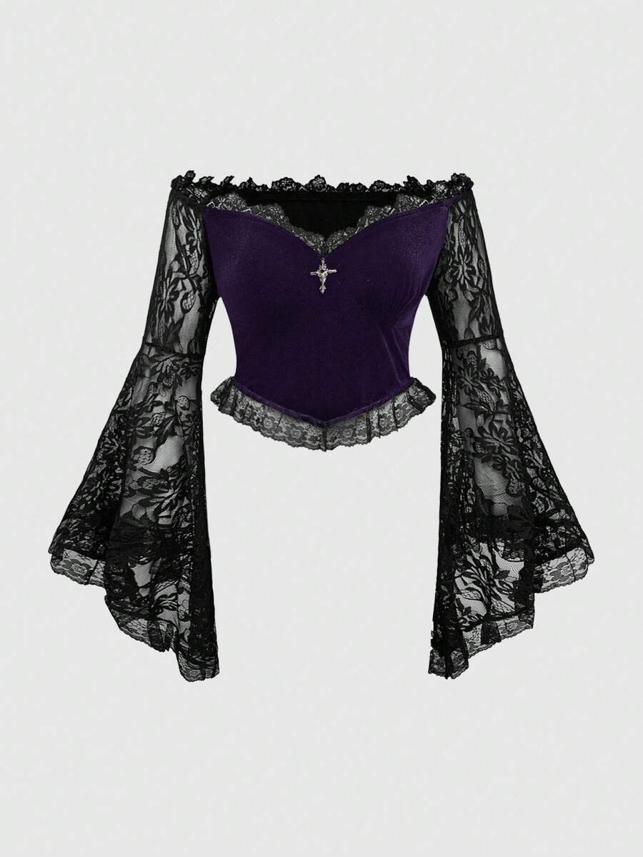 Plus Size Women Gothic Off Shoulder Lace Bell Sleeve Velvet Fitted Top