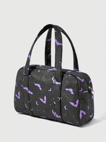 Goth Purple Corduroy Bat Print Bow Decor Women Handbag, Stylish And Portable, Halloween, Halloween Bags Perfect For Fancy Party Matching With Halloween Costumes