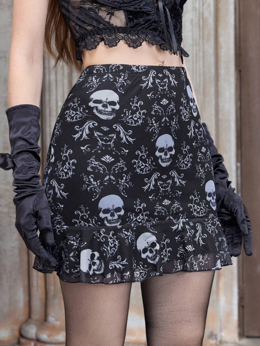 Goth Skull Print Ruffle Hem Skirt
