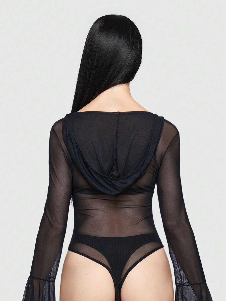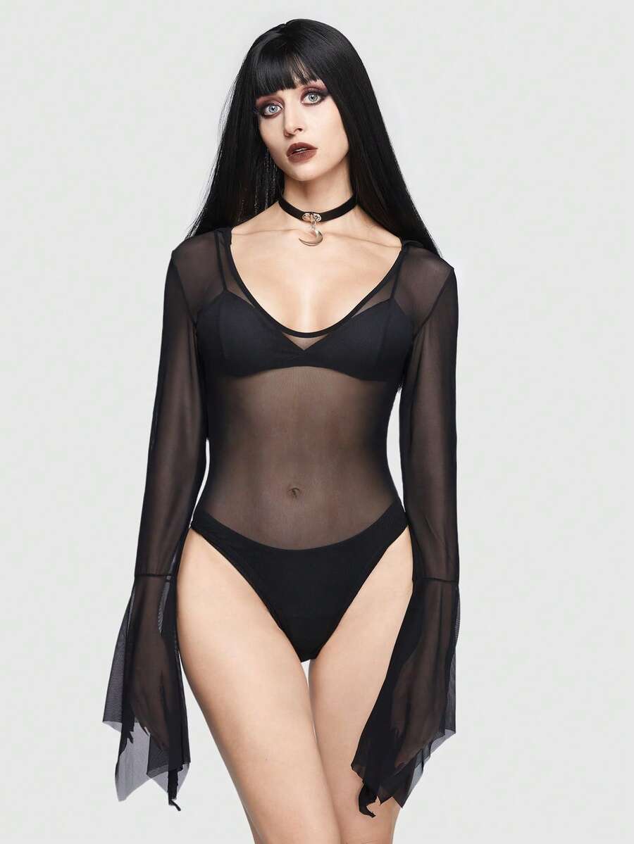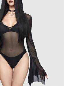Goth Solid Trumpet Sleeve Mesh Teddy Bodysuit
