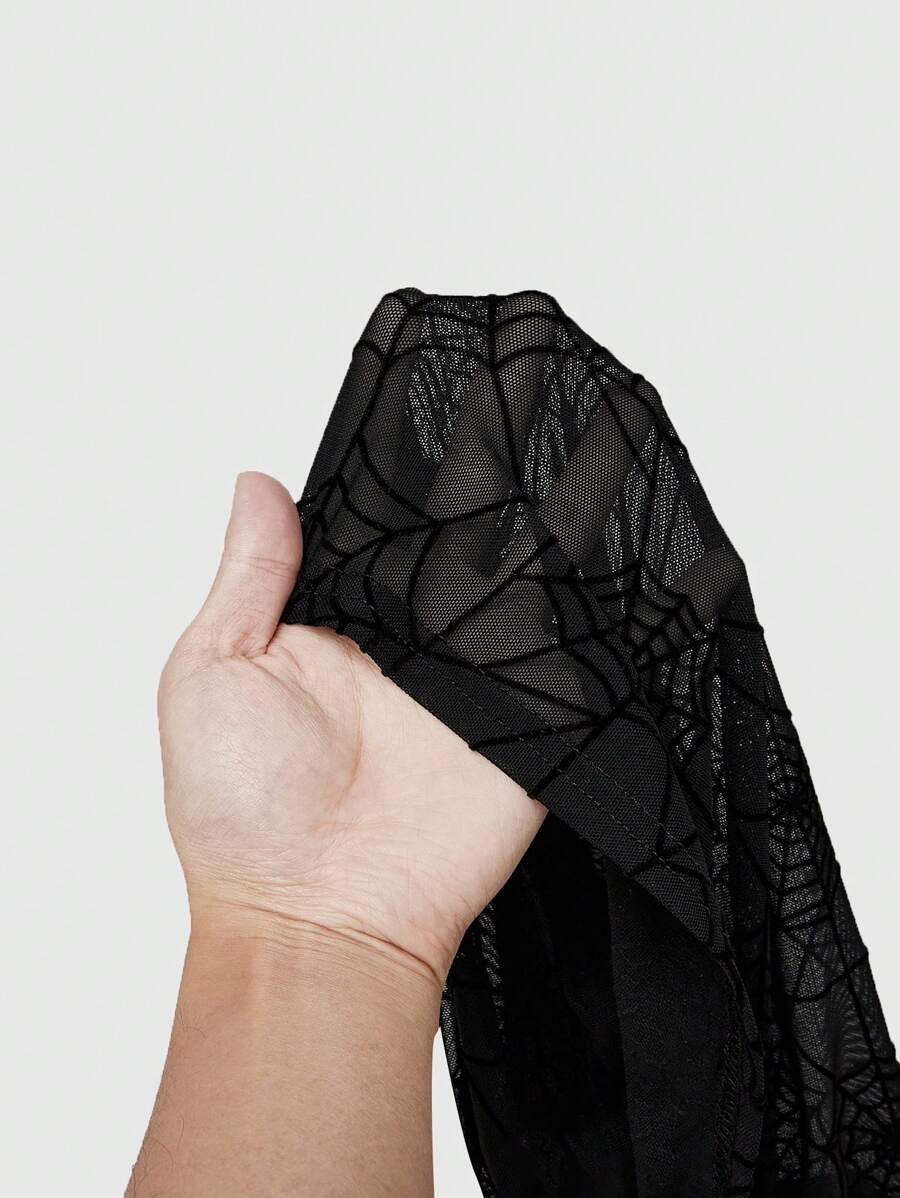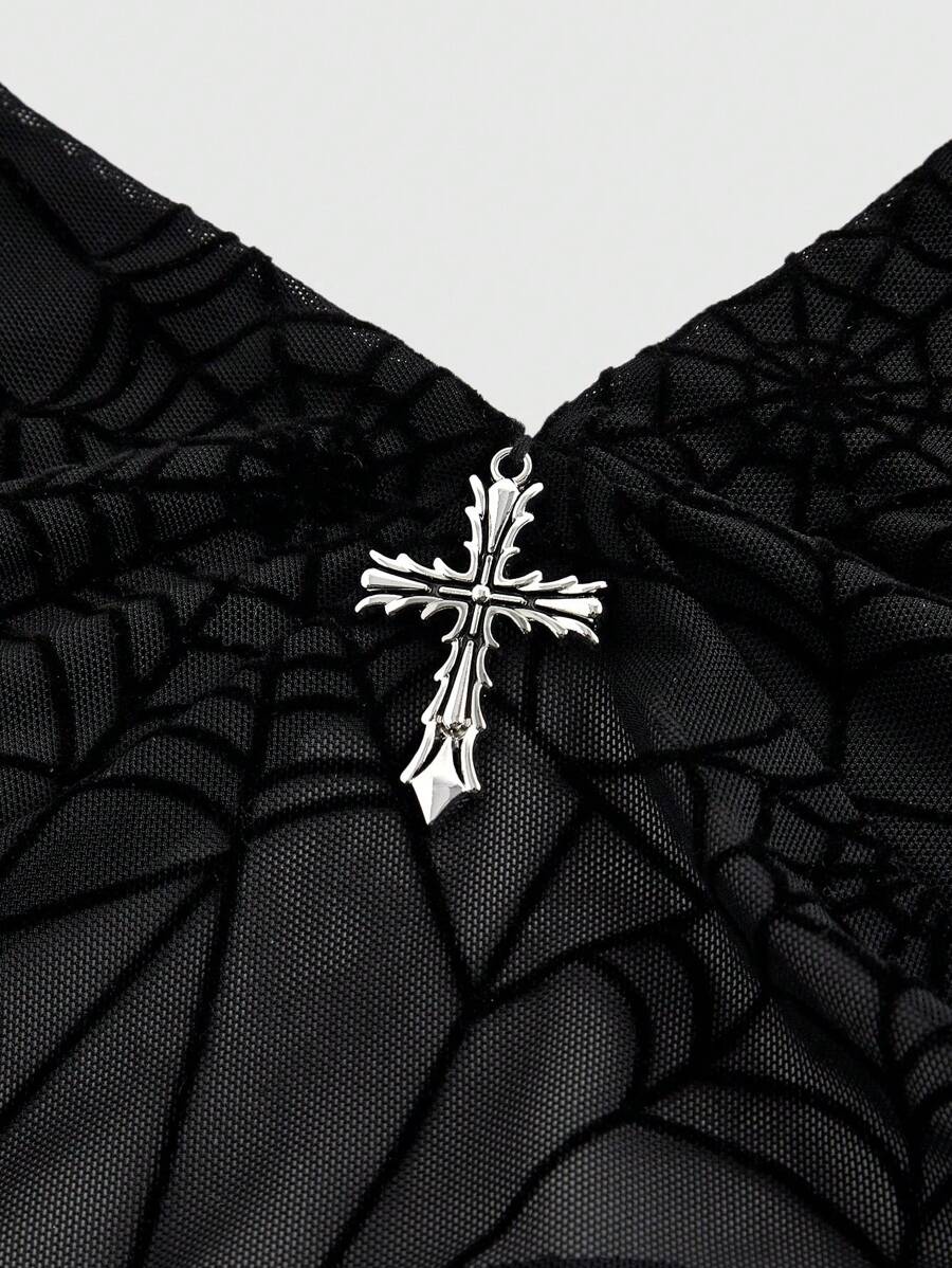 Goth Spider Web Flocked Slim Fit Halter Neck Tank Top For Women