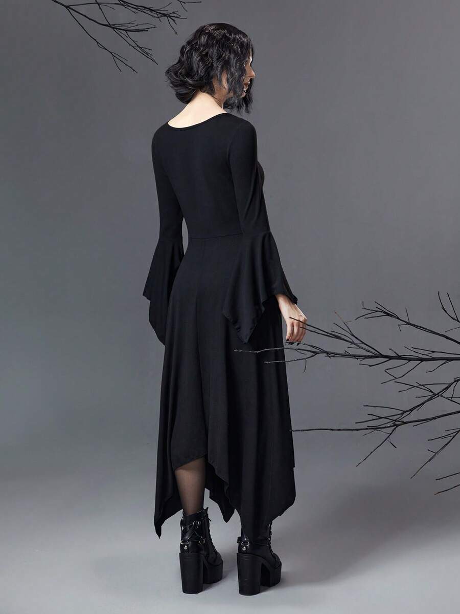 Goth Sun Print Flounce Sleeve Hanky Hem Dress