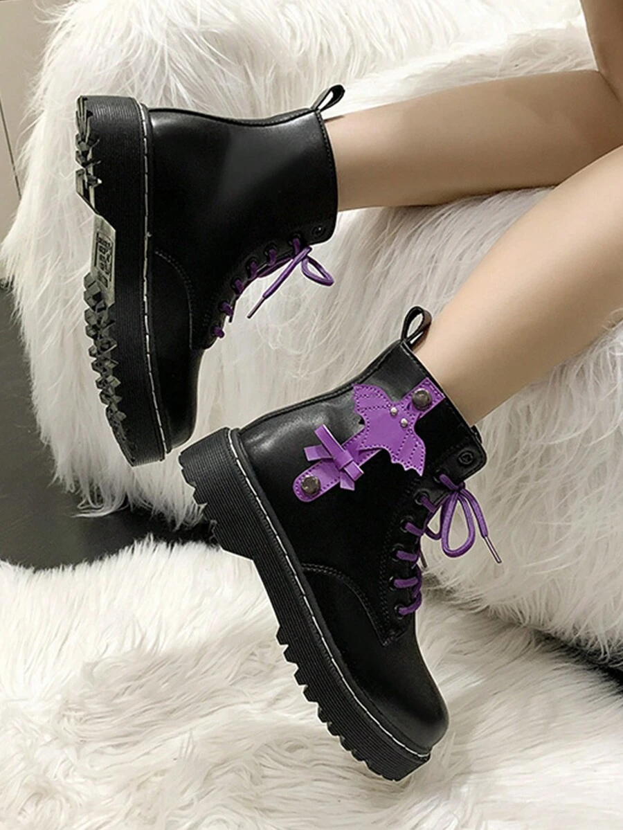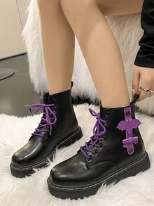 Goth Women Bat Buckle Decor Lace-up Front Combat Boots, Punk Outdoor Fashion Boots