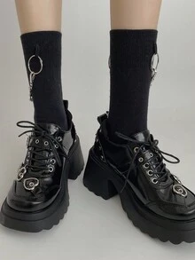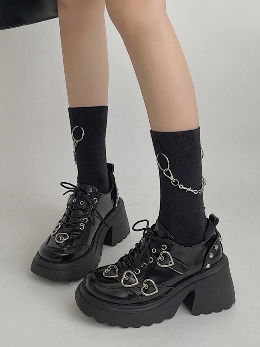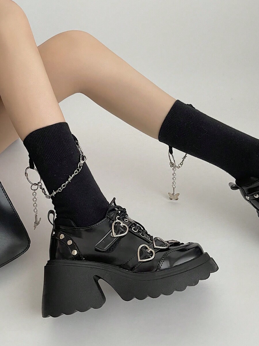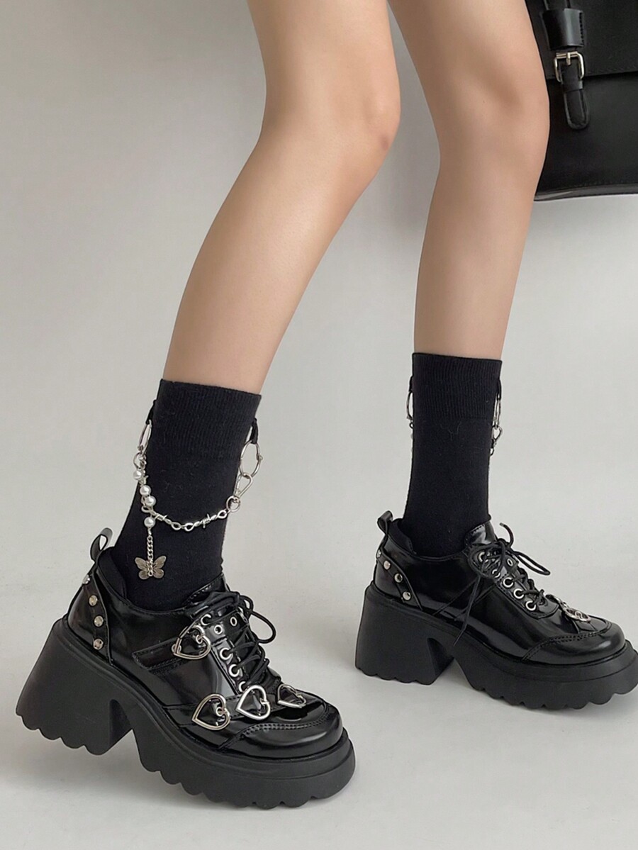 Goth Women Heart Decor Lace-up Front Platform Oxford Shoes, Punk Outdoor Shoes