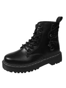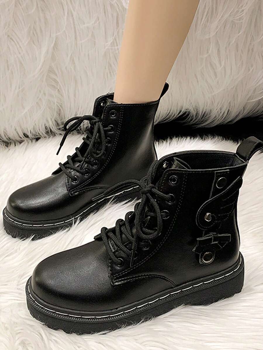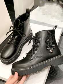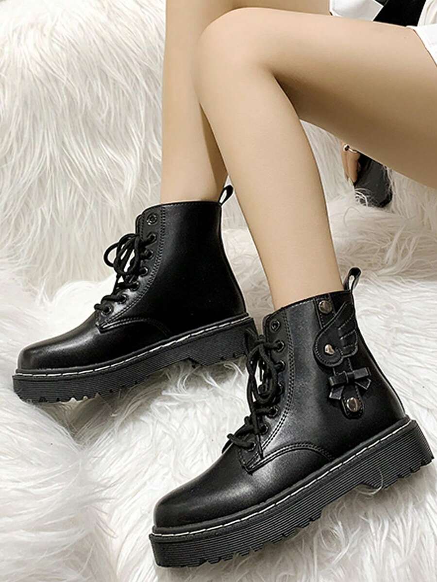 Goth Women Minimalist Wings Decor Lace Up Front Combat Boots, Cool Outdoor Fashion Boots