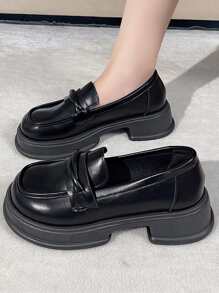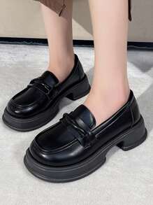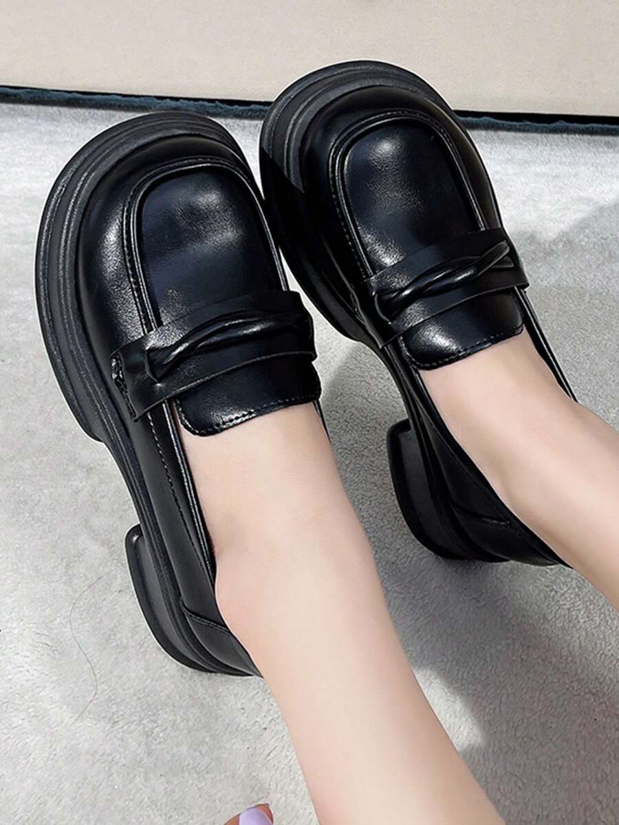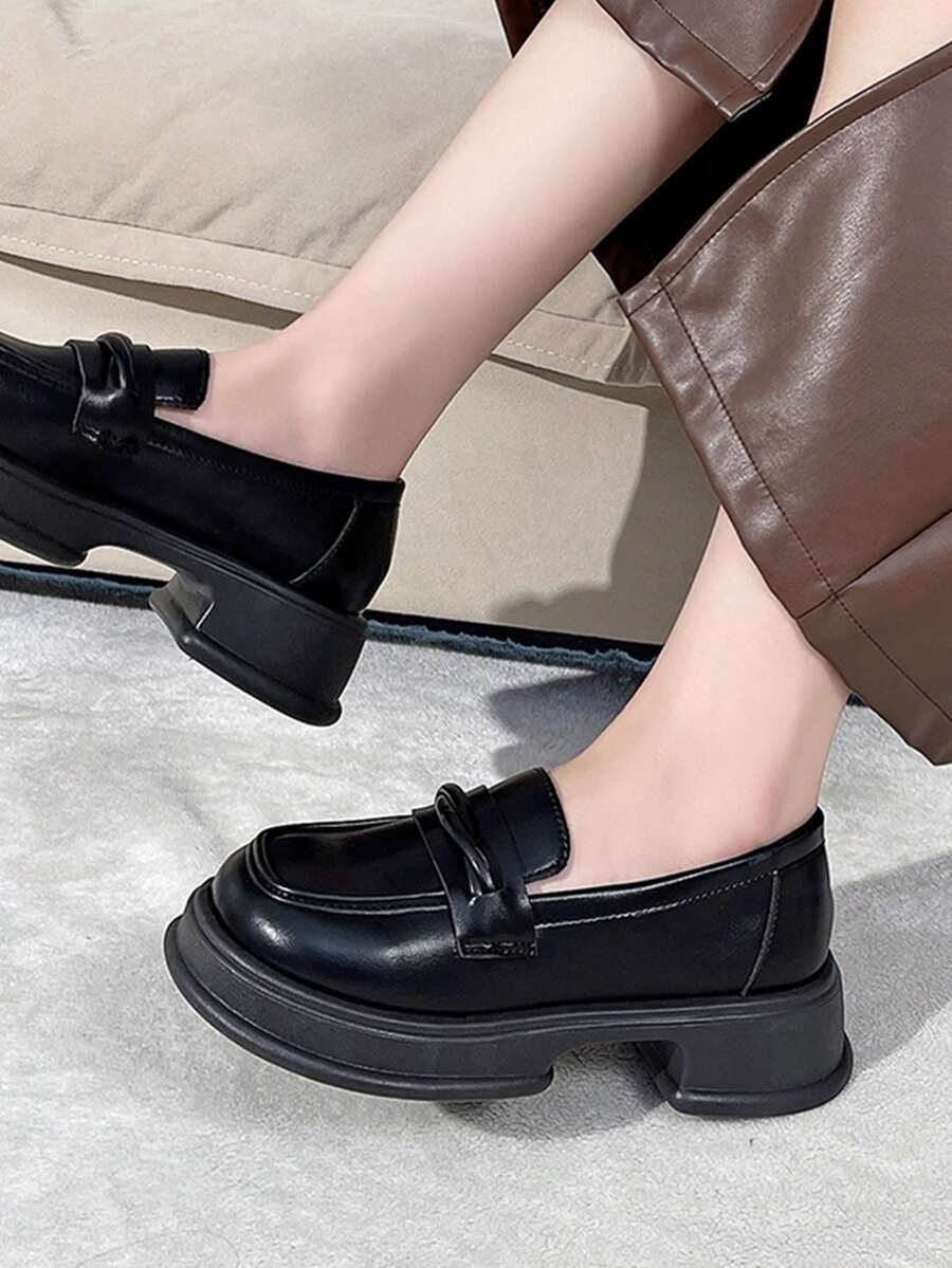 Goth Women's Black Leather Work Loafers, Slip-Resistant Soft Sole English Style High Heel Shoes For Office